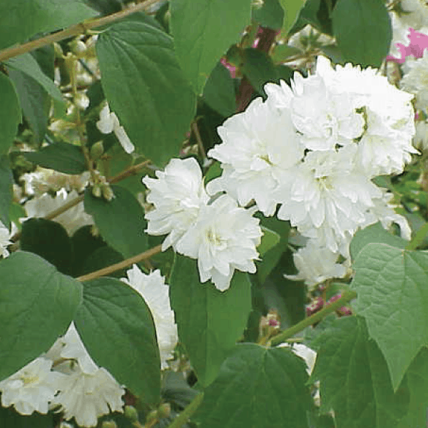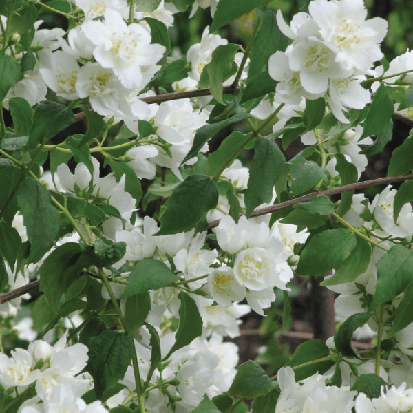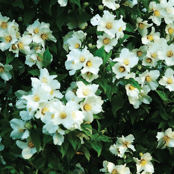Philadelphus in variety: Mainly tall arching deciduous shrubs having richly scented flowers in early summer. Usually grow to around 4-6 feet and prefer full sun or partial shade. Most common varieties on the nursery include Philadelphus Lemoinei, Philadelphus Belle Etoile and Philadelphus Virginal.