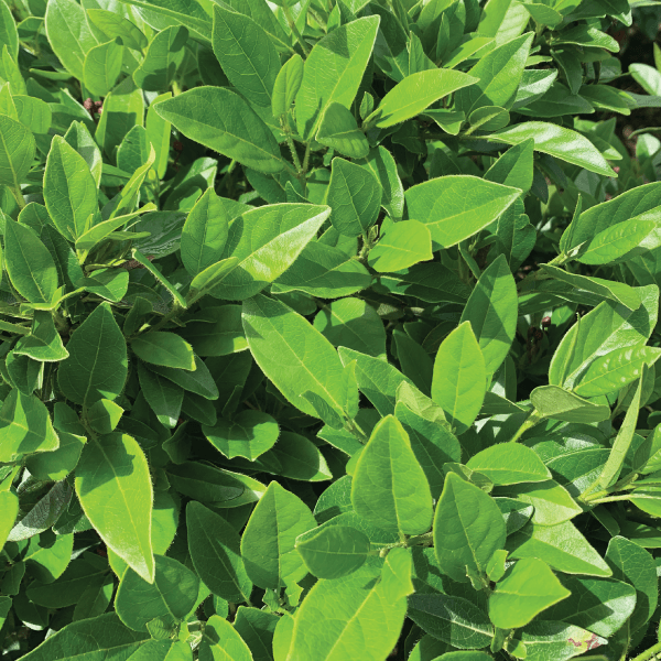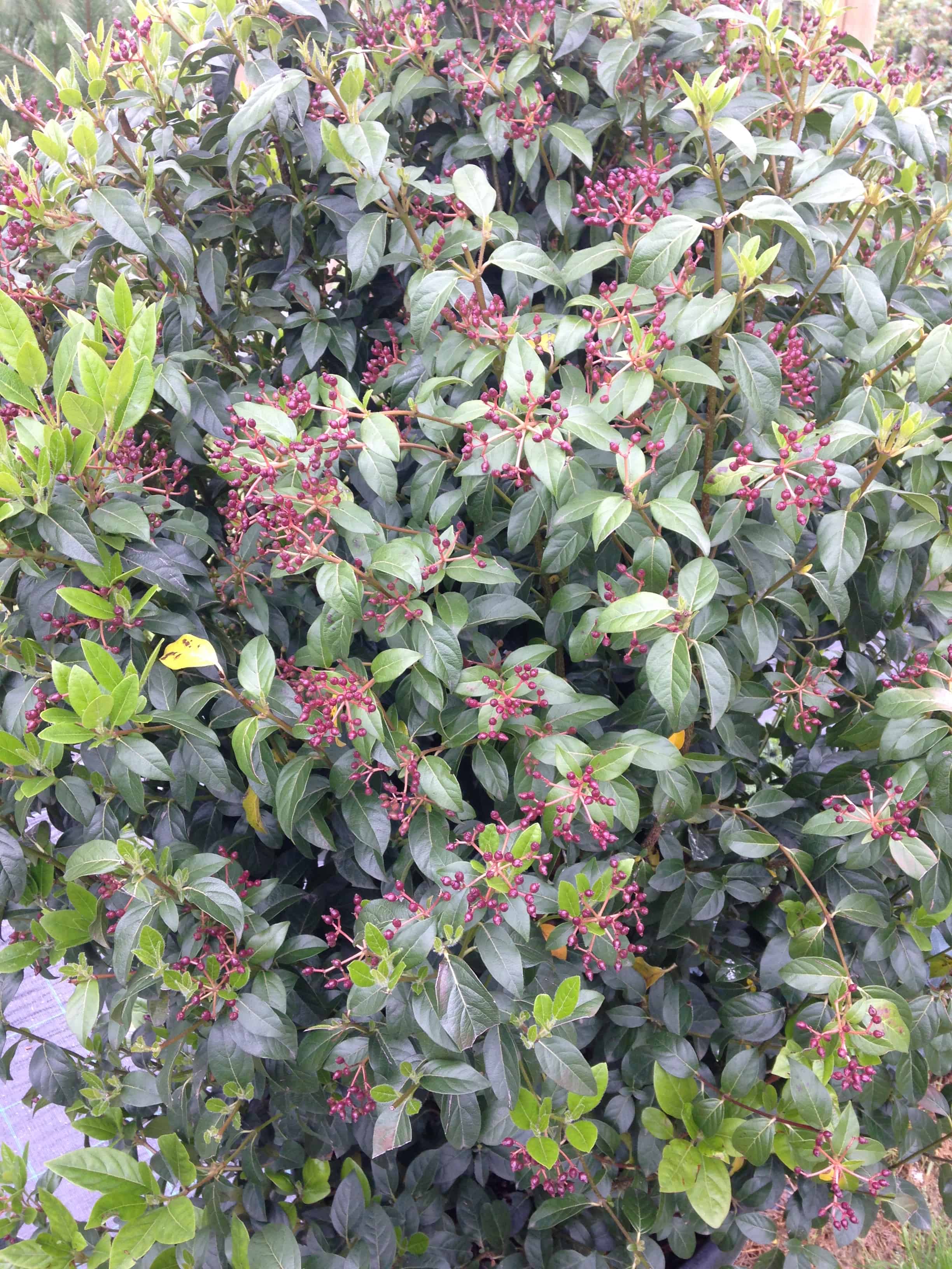 Viburnum tinus: A large, evergreen shrub to 3m with dark green, oval leaves. Clusters of small, creamy-white flowers, often pink-tinged in bud, are produced over a long period in late winter and spring, followed by blue-black berries